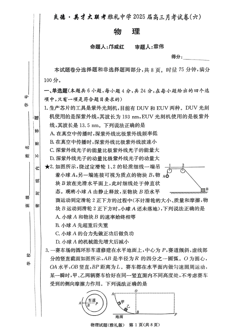 湖南省长沙市雅礼中学2025年2月高三月考试卷(六)物理+答案
