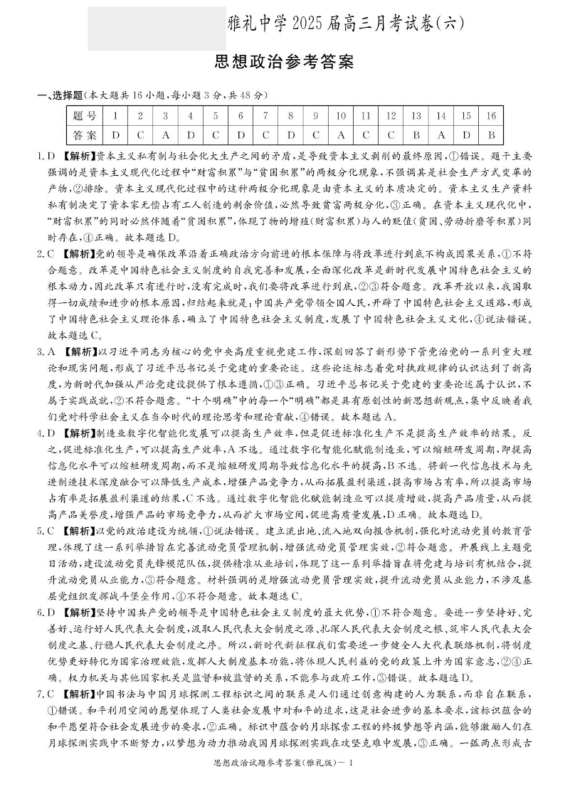 湖南省长沙市雅礼中学2025年2月高三月考试卷(六)政治答案
