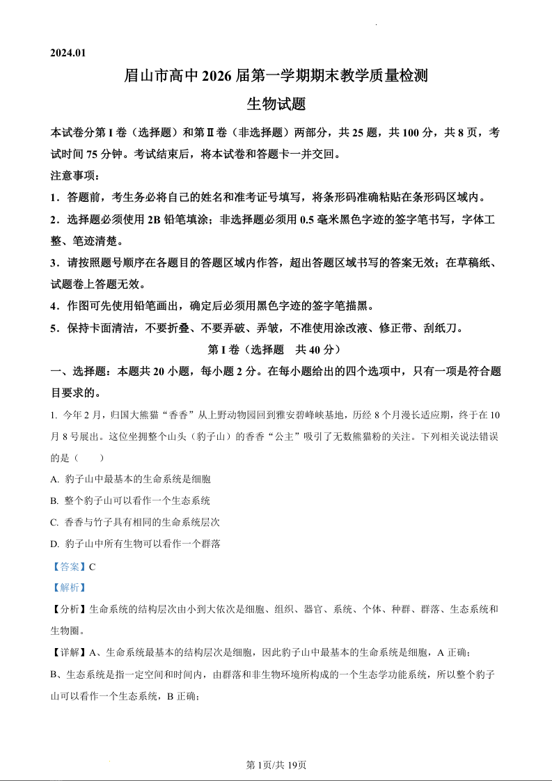 四川省眉山市2023-2024学年高一上学期期末考试生物(精品解析版)