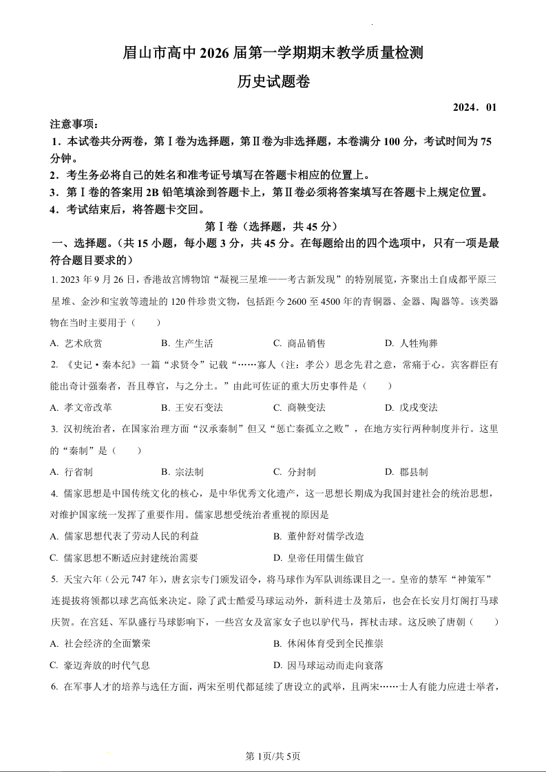 四川省眉山市2023-2024学年高一上学期期末考试历史(原卷版)