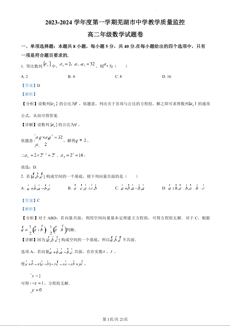 安徽省芜湖市2023-2024学年高二上学期期末考试数学(精品解析版)