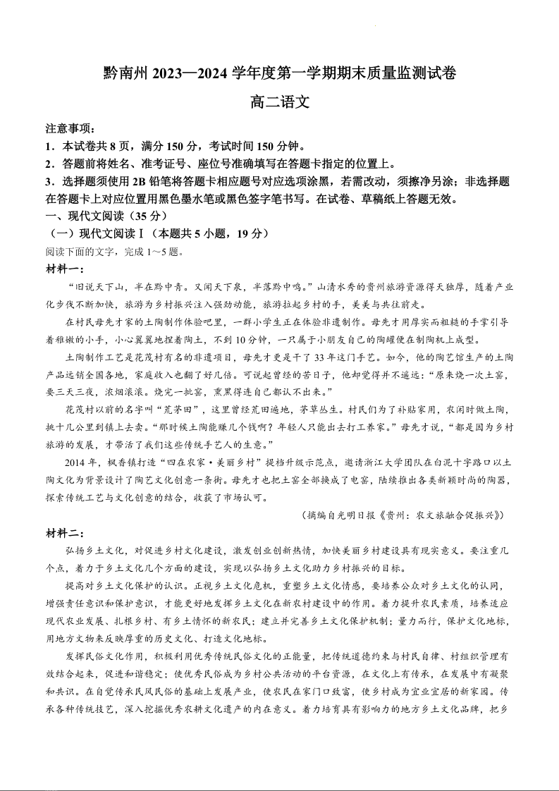 贵州省黔南州2023-2024学年高二上学期期末质量监测语文+答案