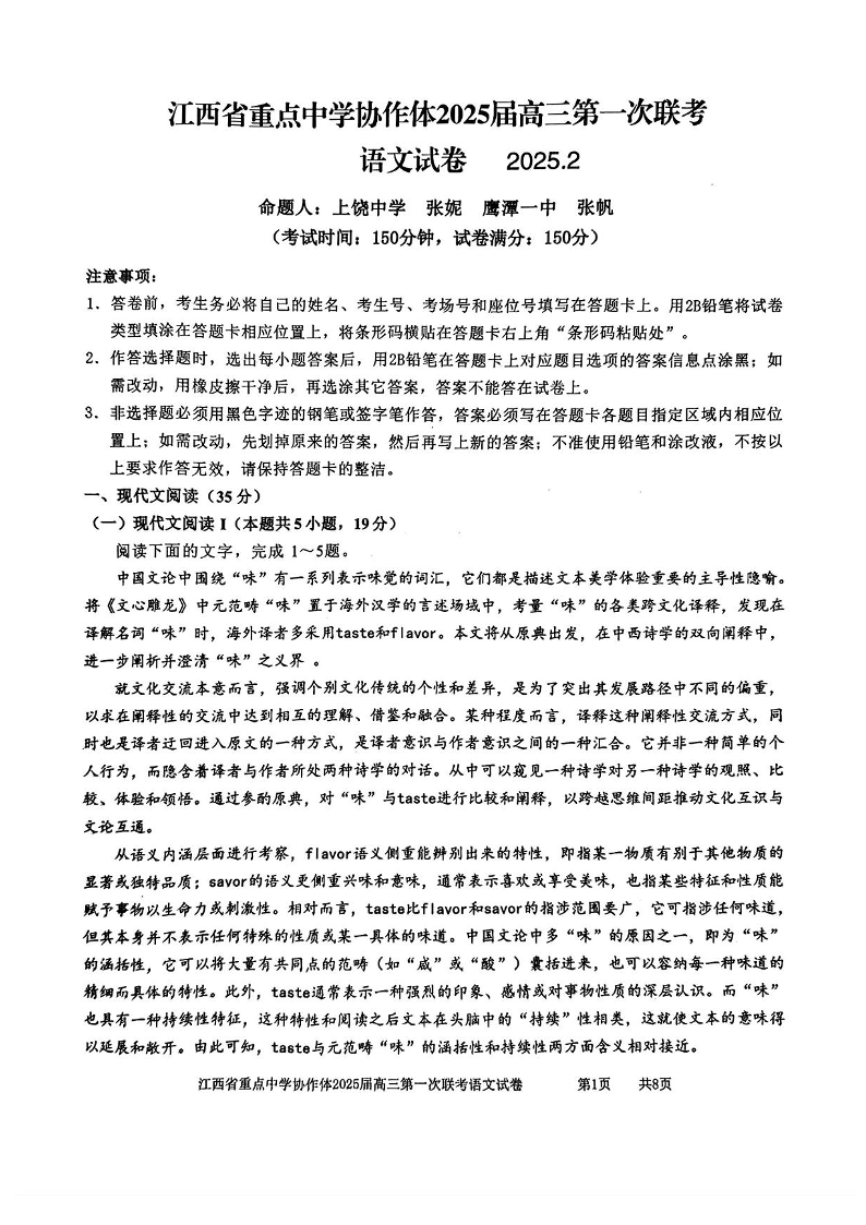 江西省重点中学协作体2025届高三下学期第一次联考语文+答案
