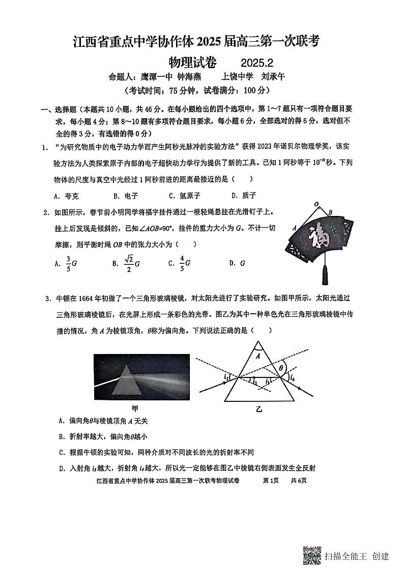 江西省重点中学协作体2025届高三下学期第一次联考物理