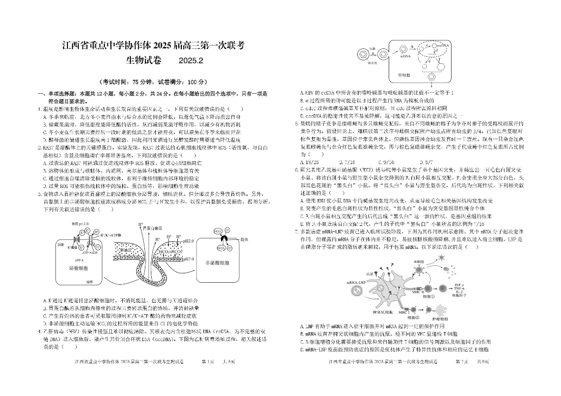 江西省重点中学协作体2025届高三下学期第一次联考生物+答案