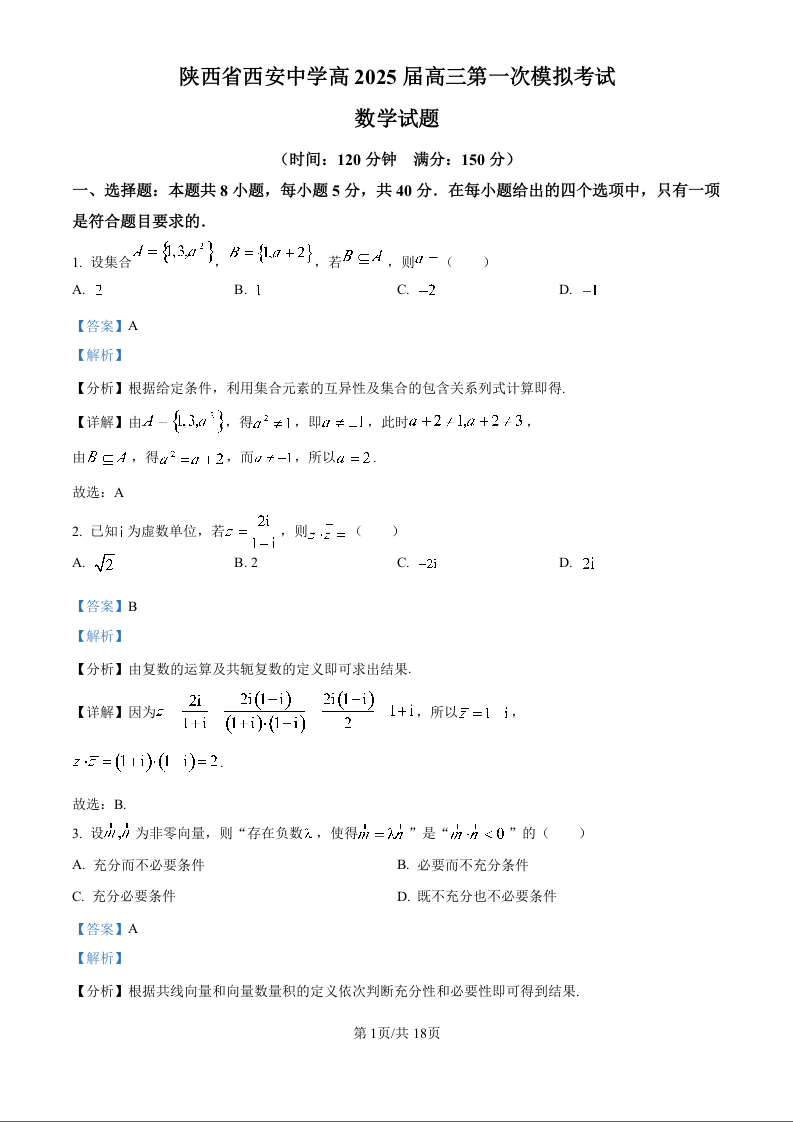 陕西省西安中学2025届高三下学期第一次模拟考试数学答案