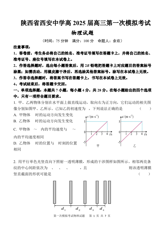 陕西省西安中学2025届高三下学期第一次模拟考试物理