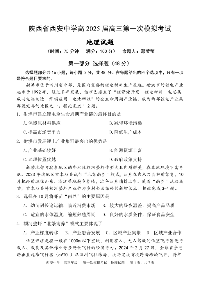 陕西省西安中学2025届高三下学期第一次模拟考试地理