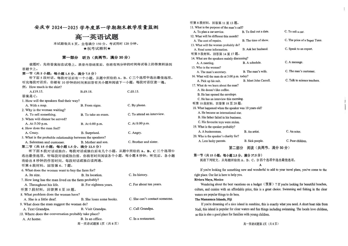 安徽省安庆市2024-2025学年上学期1月高一期末考试英语