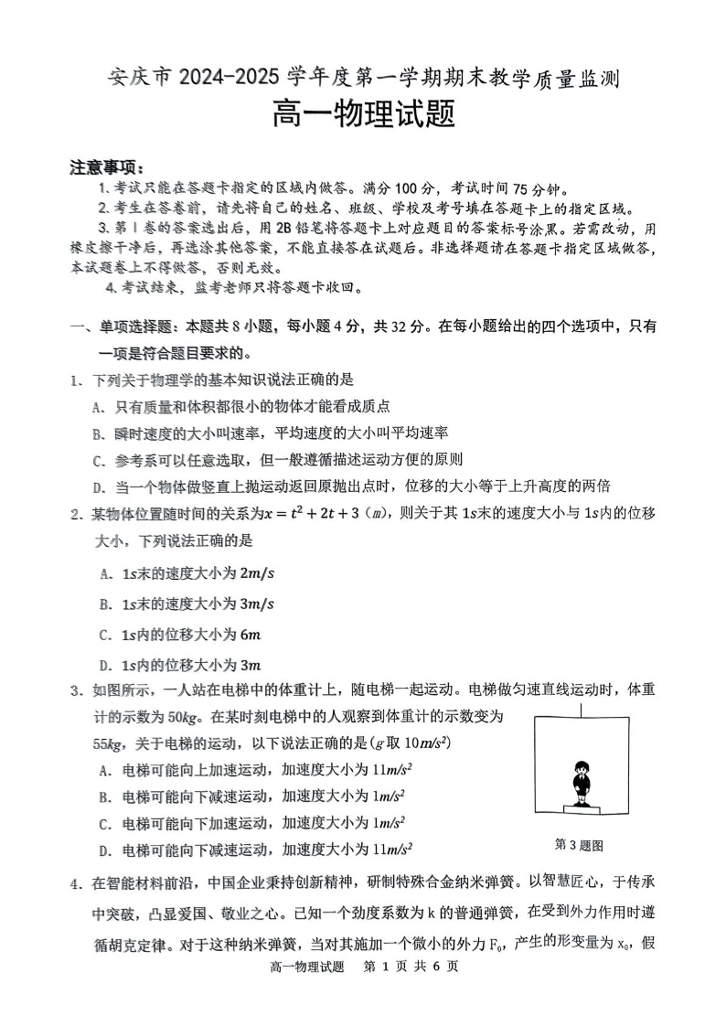 安徽省安庆市2024-2025学年高一上学期1月期末考试物理