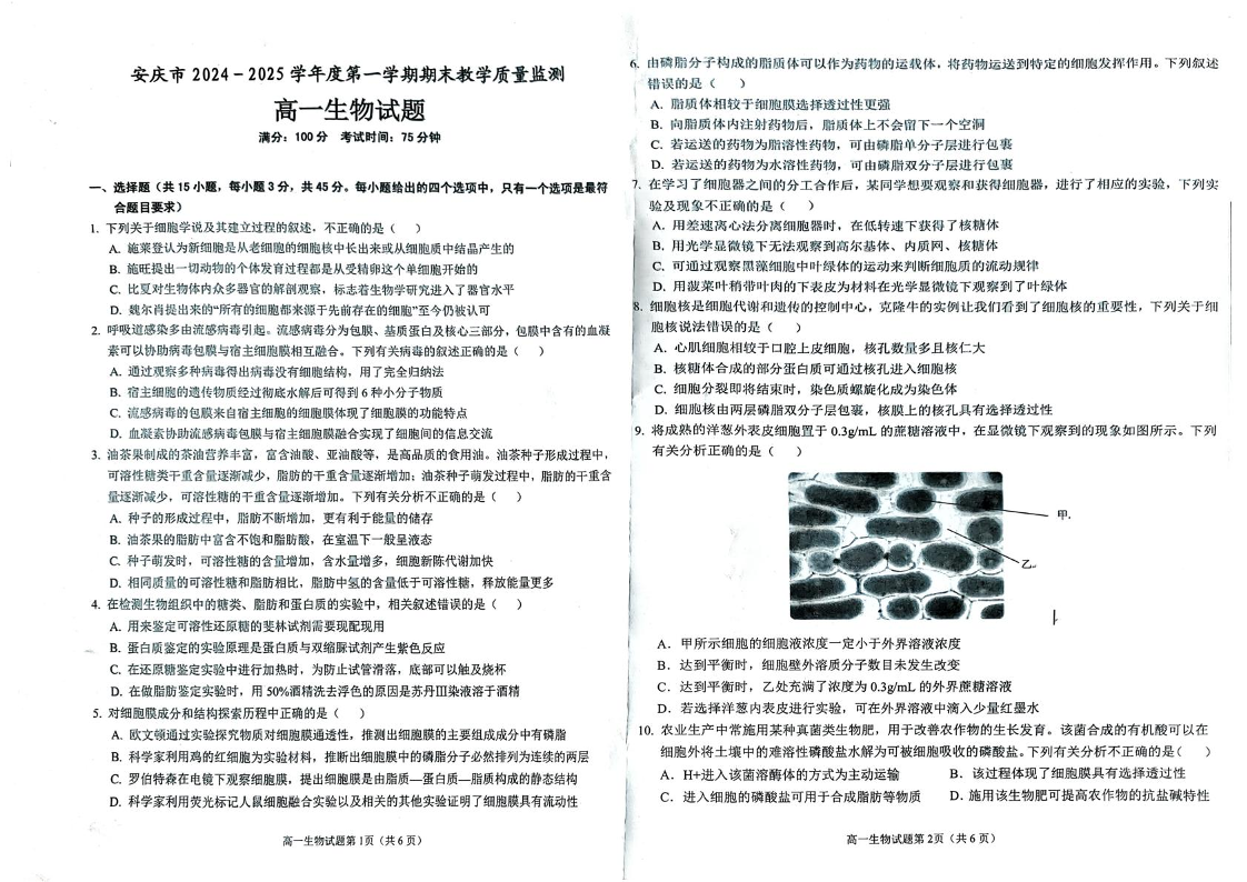 安徽省安庆市2024-2025学年上学期1月高一期末考试生物