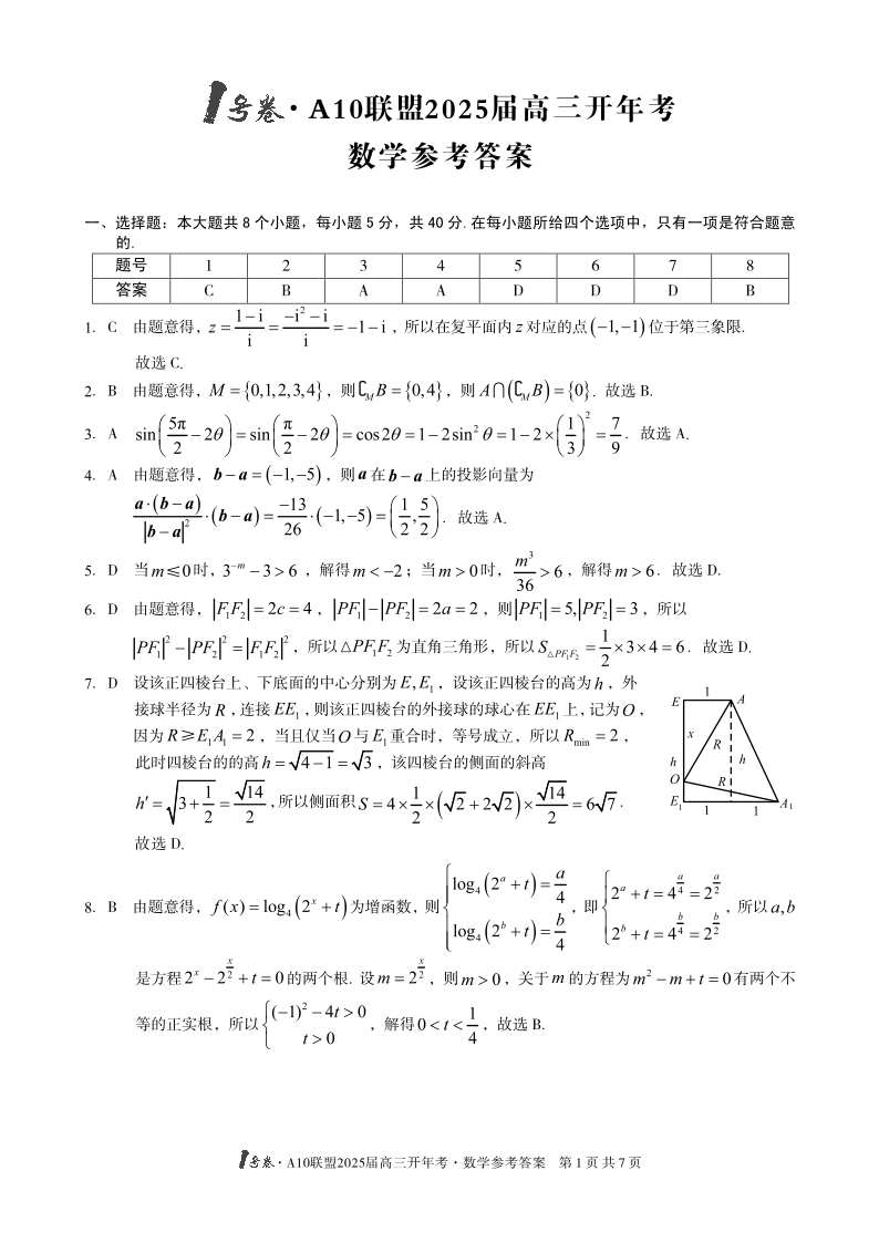 安徽省1号卷·A10联盟2025届高三下学期2月开年考数学答案