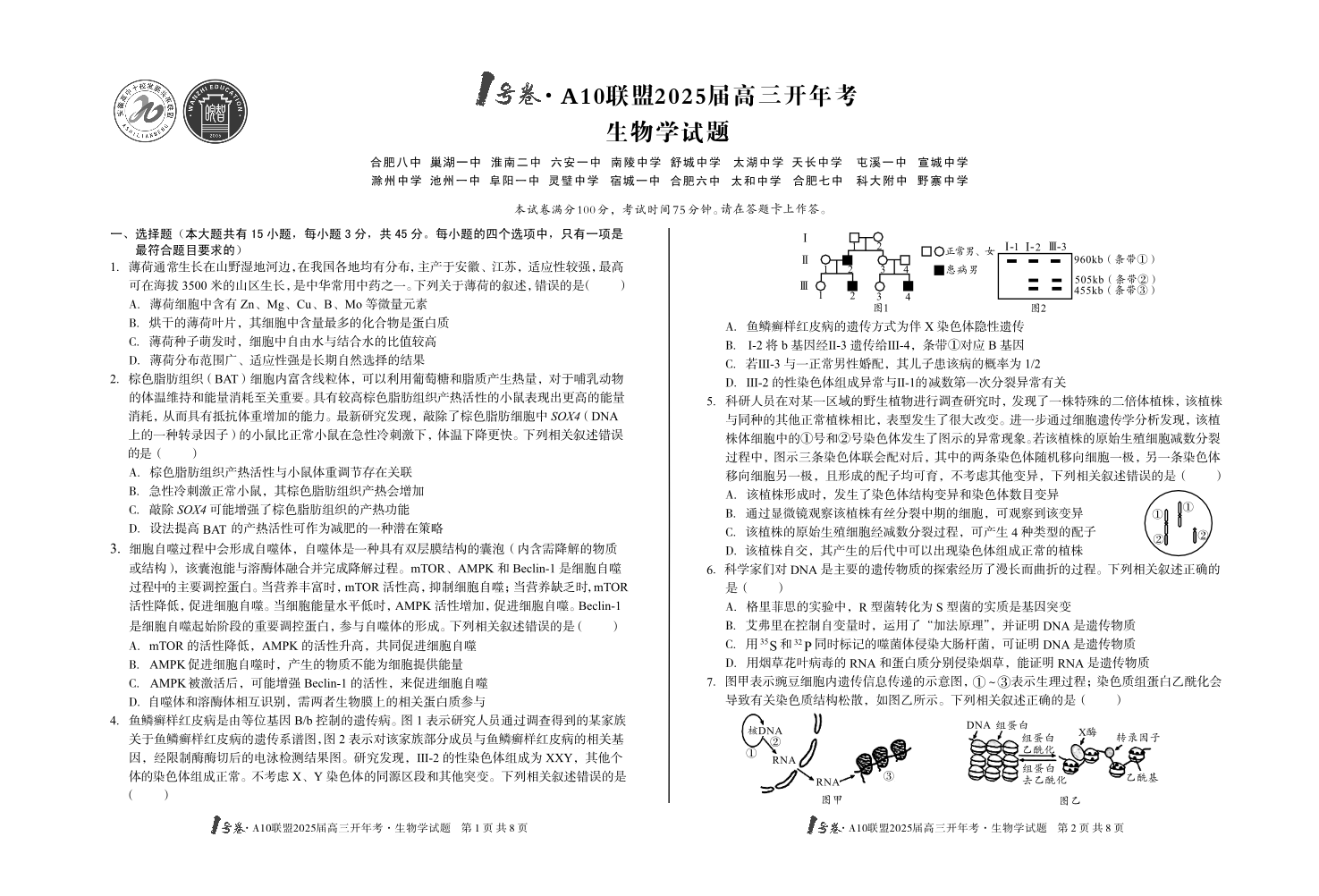 安徽省1号卷·A10联盟2025届高三下学期2月开年考生物