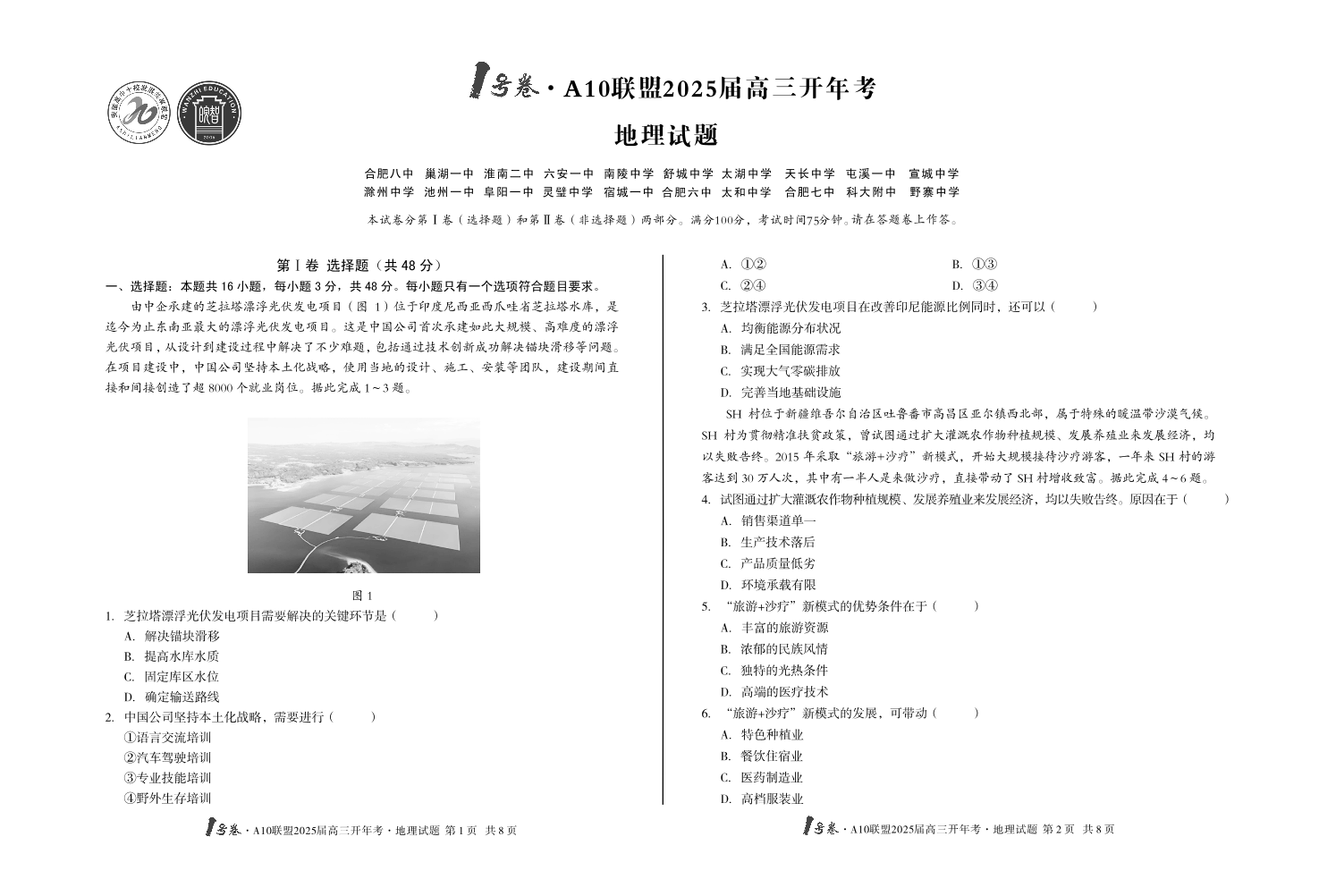 安徽省1号卷·A10联盟2025届高三下学期2月开年考地理