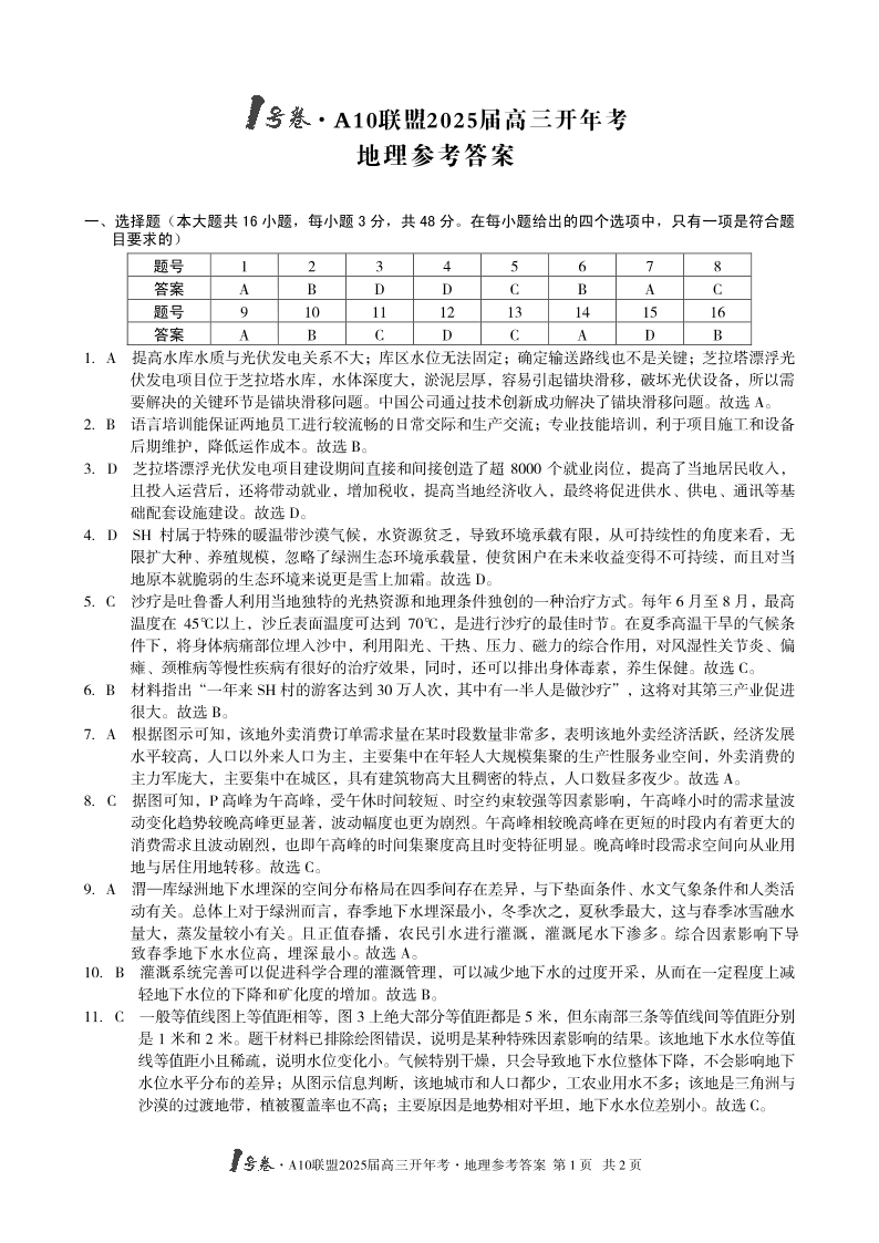 安徽省1号卷·A10联盟2025届高三下学期2月开年考地理答案