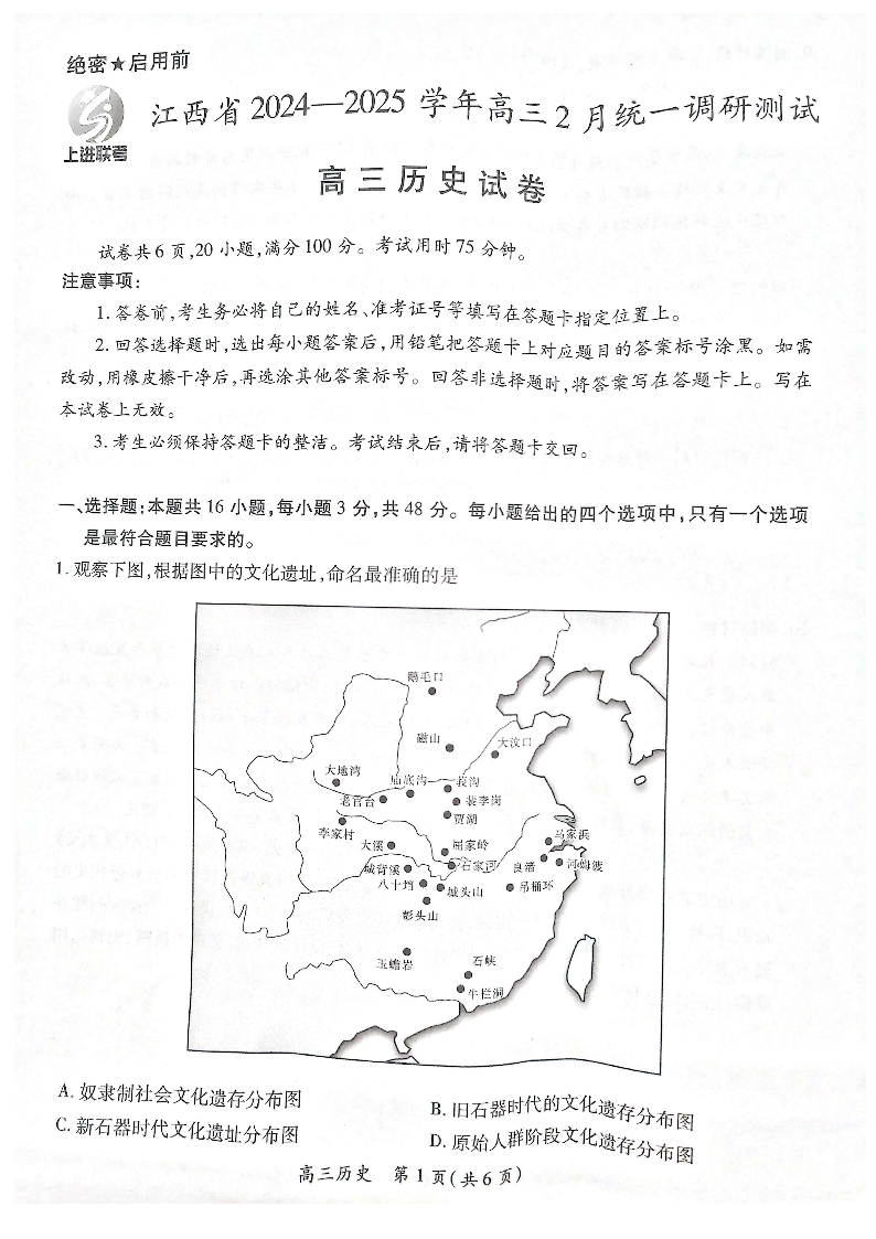 江西省上进联考2025届高三下学期2月统一调研测试历史+答案