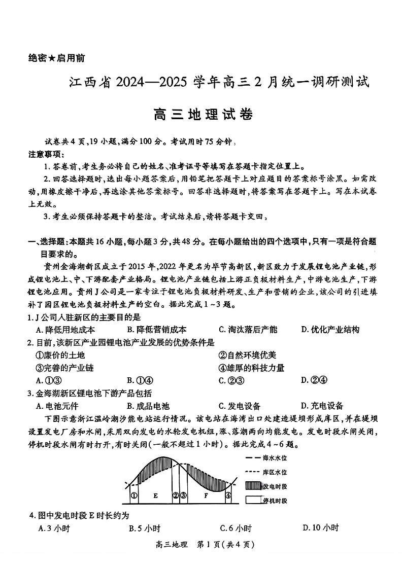 江西省上进联考2025届高三下学期2月统一调研测试地理+答案