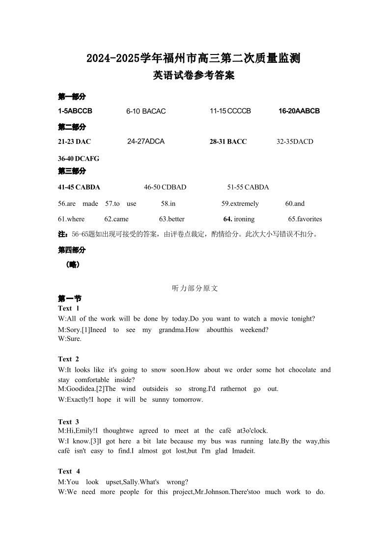 福建省福州市2024-2025学年下学期2月高三第二次质量检测英语答案