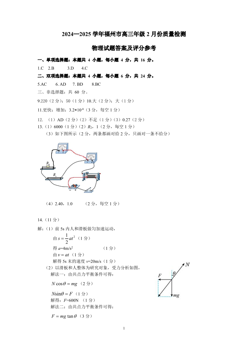 福建省福州市2024-2025学年下学期2月高三第二次质量检测物理答案
