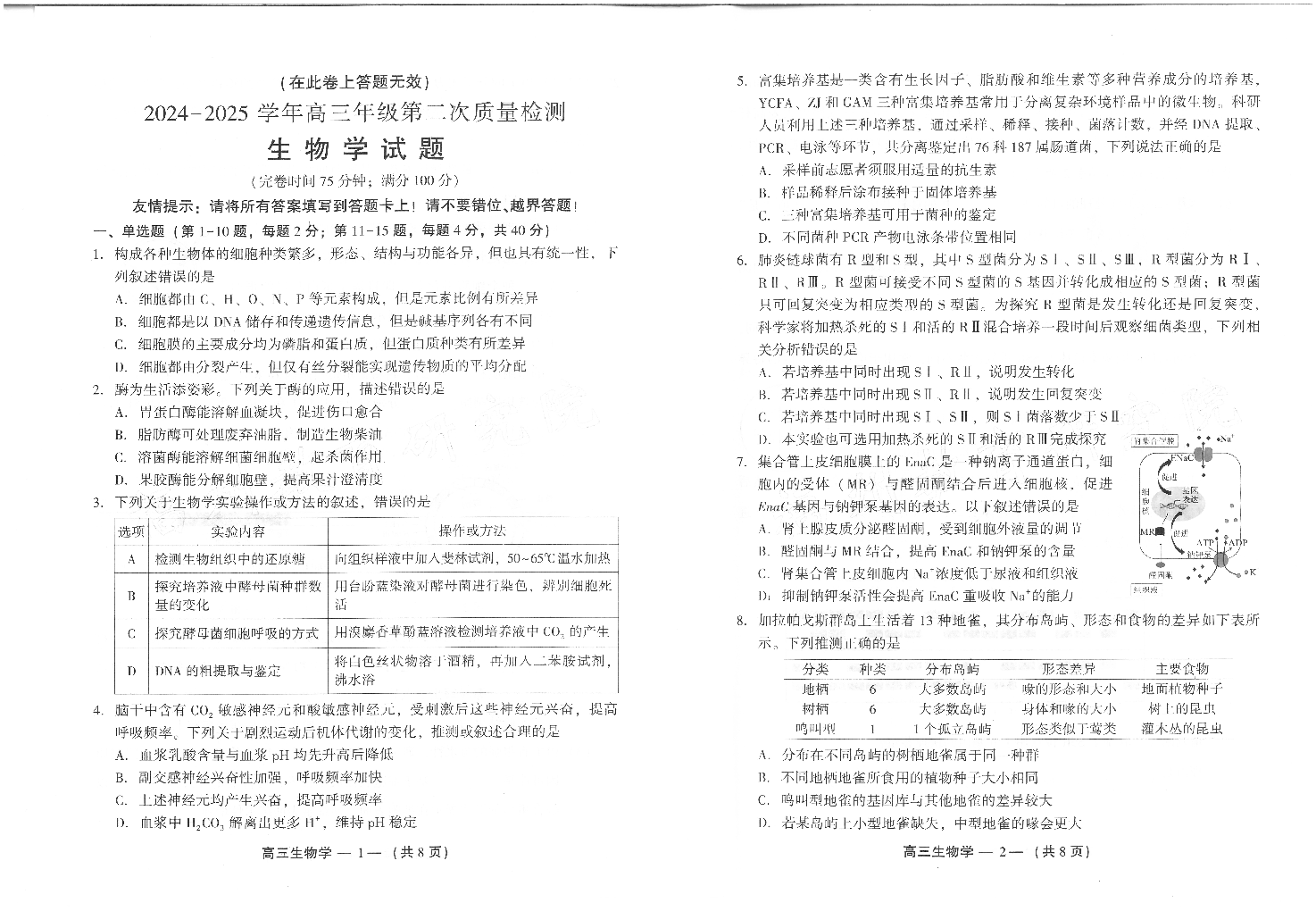 福建省福州市2024-2025学年下学期2月高三第二次质量检测生物