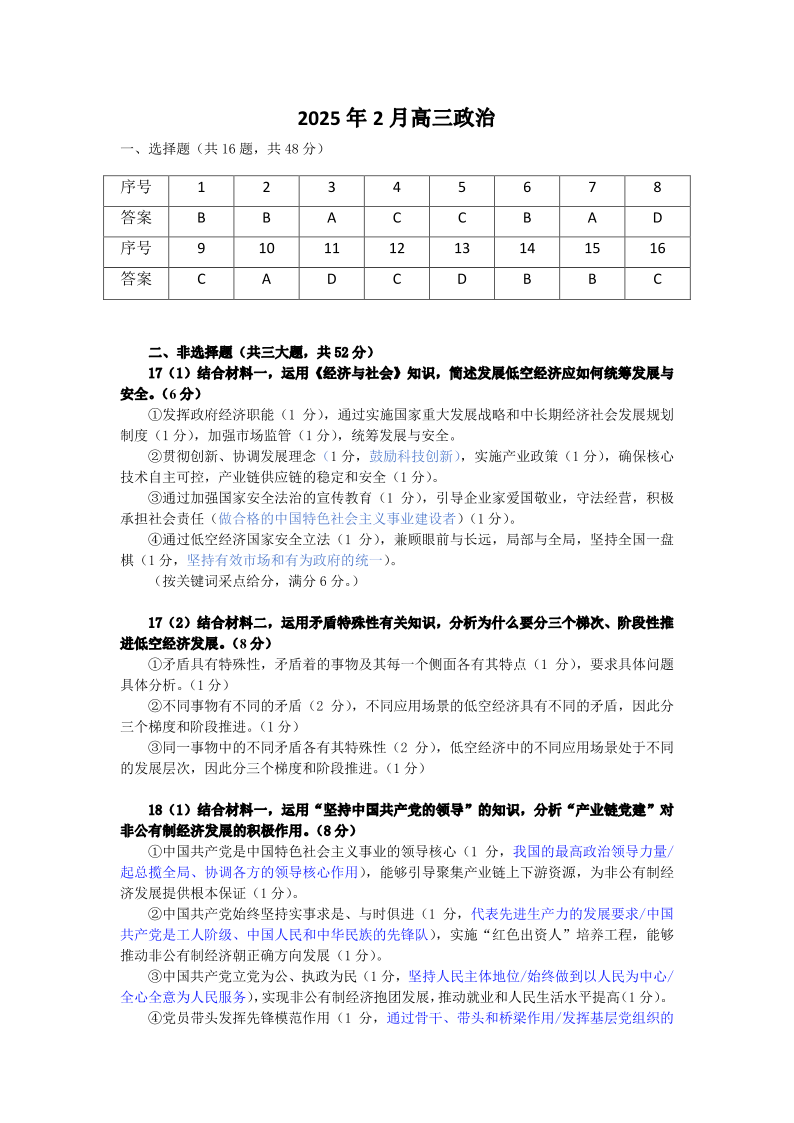 福建省福州市2024-2025学年下学期2月高三第二次质量检测政治答案