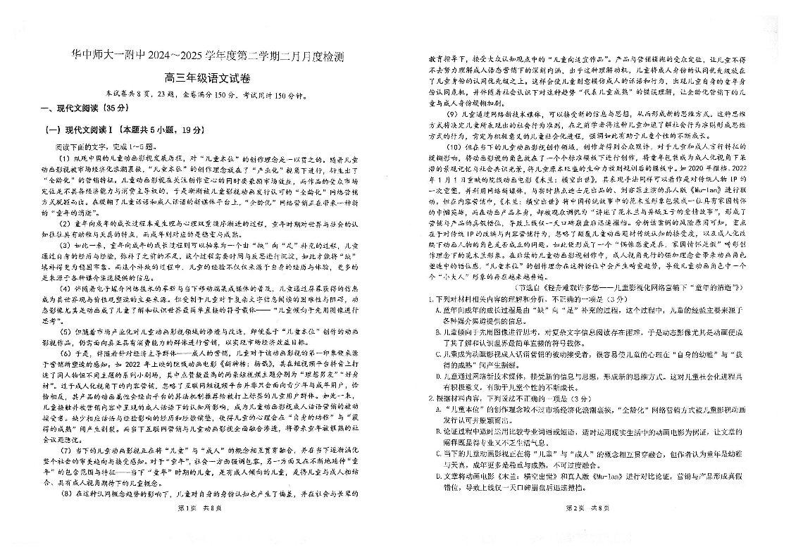 湖北省华中师大一附中2024-2025学年下学期2月高三开学考试语文
