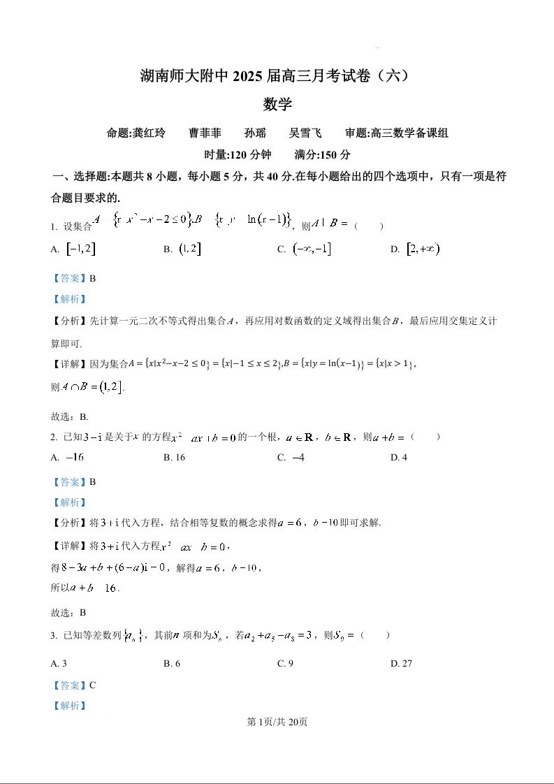 湖南省师大附中2024-2025 学年下学期2月高三月考试卷(六)数学(精品解析版)