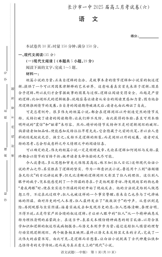 湖南省长沙市一中 2024-2025 学年下学期2月高三月考试卷(六)语文