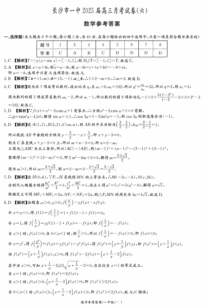 湖南省长沙市一中 2024-2025 学年下学期2月高三月考试卷(六)数学答案