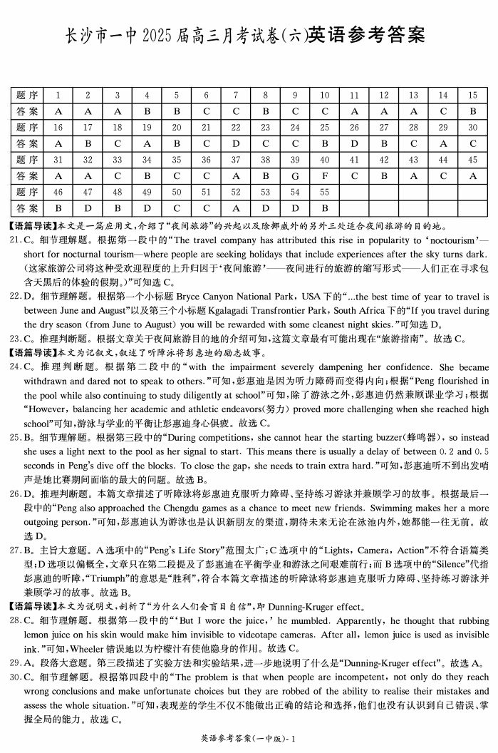 湖南省长沙市一中 2024-2025 学年下学期2月高三月考试卷(六)英语答案