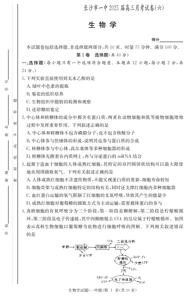 湖南省长沙市一中 2024-2025 学年下学期2月高三月考试卷(六)生物