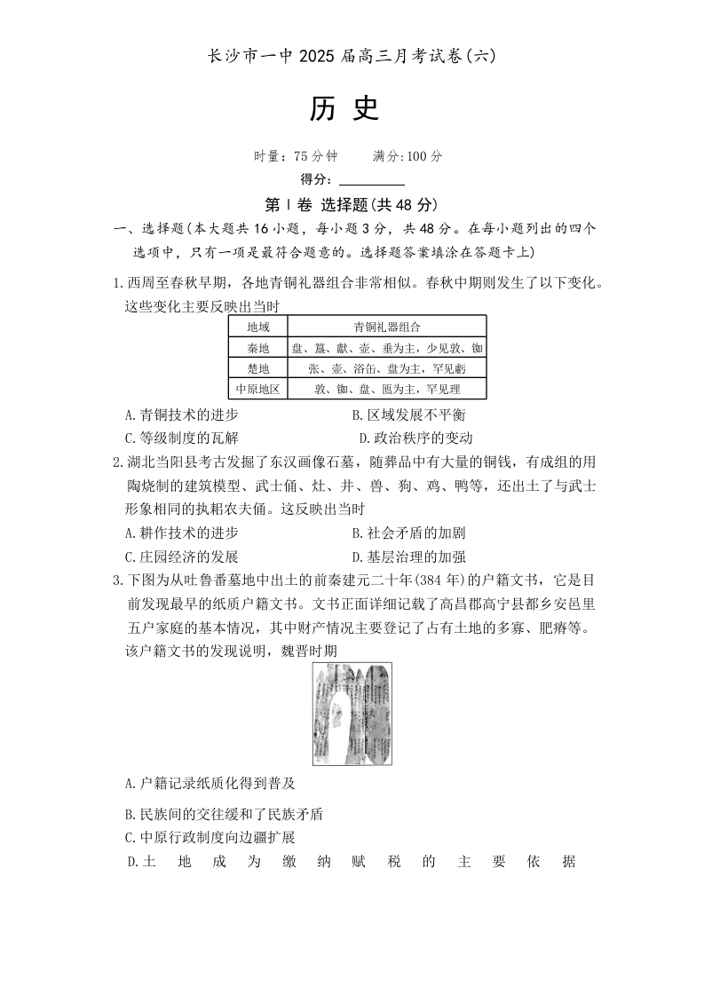湖南省长沙市一中 2024-2025 学年下学期2月高三月考试卷(六)历史