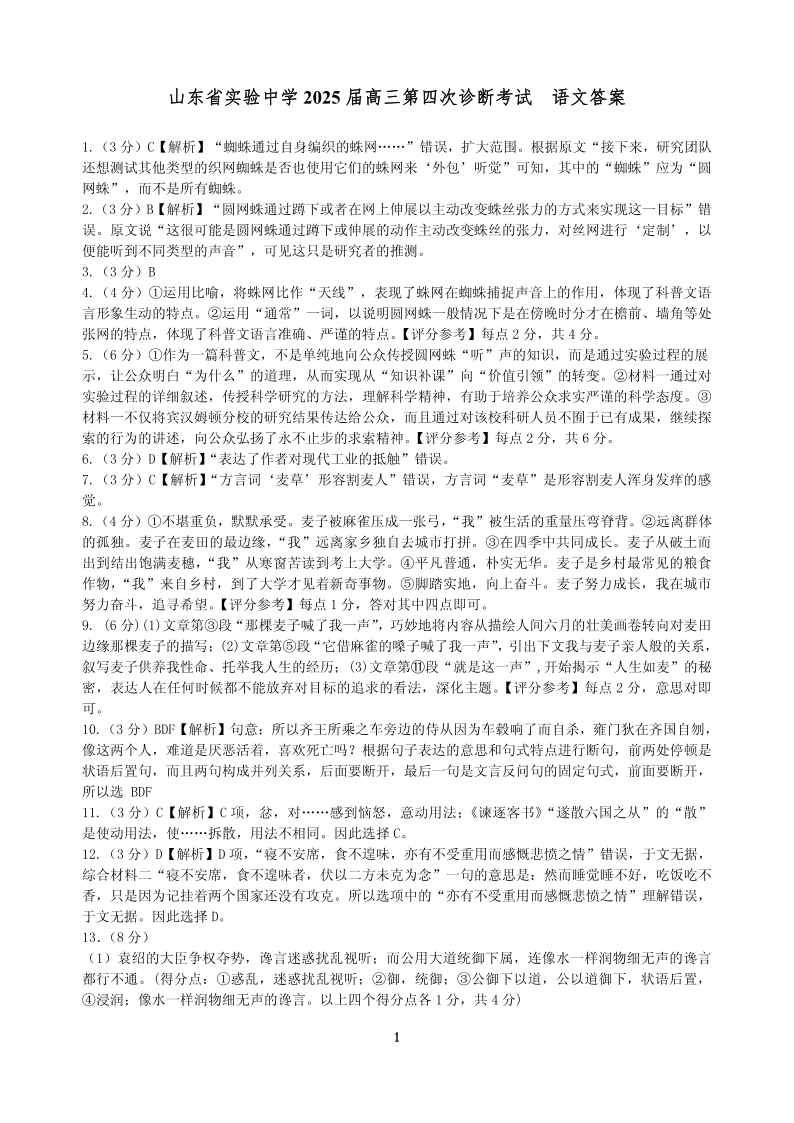 山东省实验中学2024-2025学年下学期2月第四次诊断考试语文答案