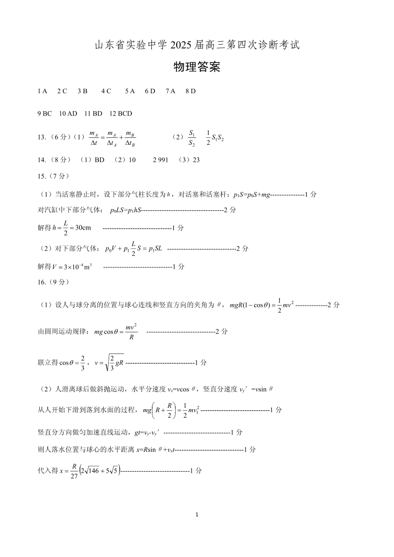 山东省实验中学2024-2025学年下学期2月第四次诊断考试物理答案