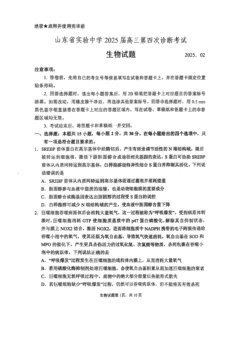 山东省实验中学2024-2025学年下学期2月第四次诊断考试生物学