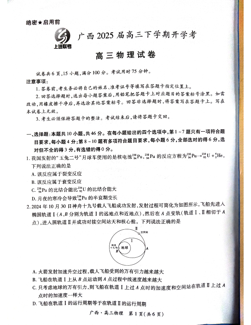 广西省稳派上进联考2024-2025学年下学期2月高三开学考试物理