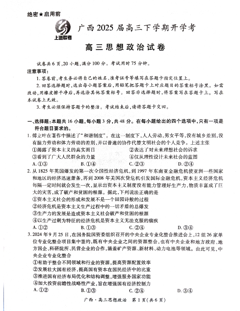广西省稳派上进联考2024-2025学年下学期2月高三开学考试政治