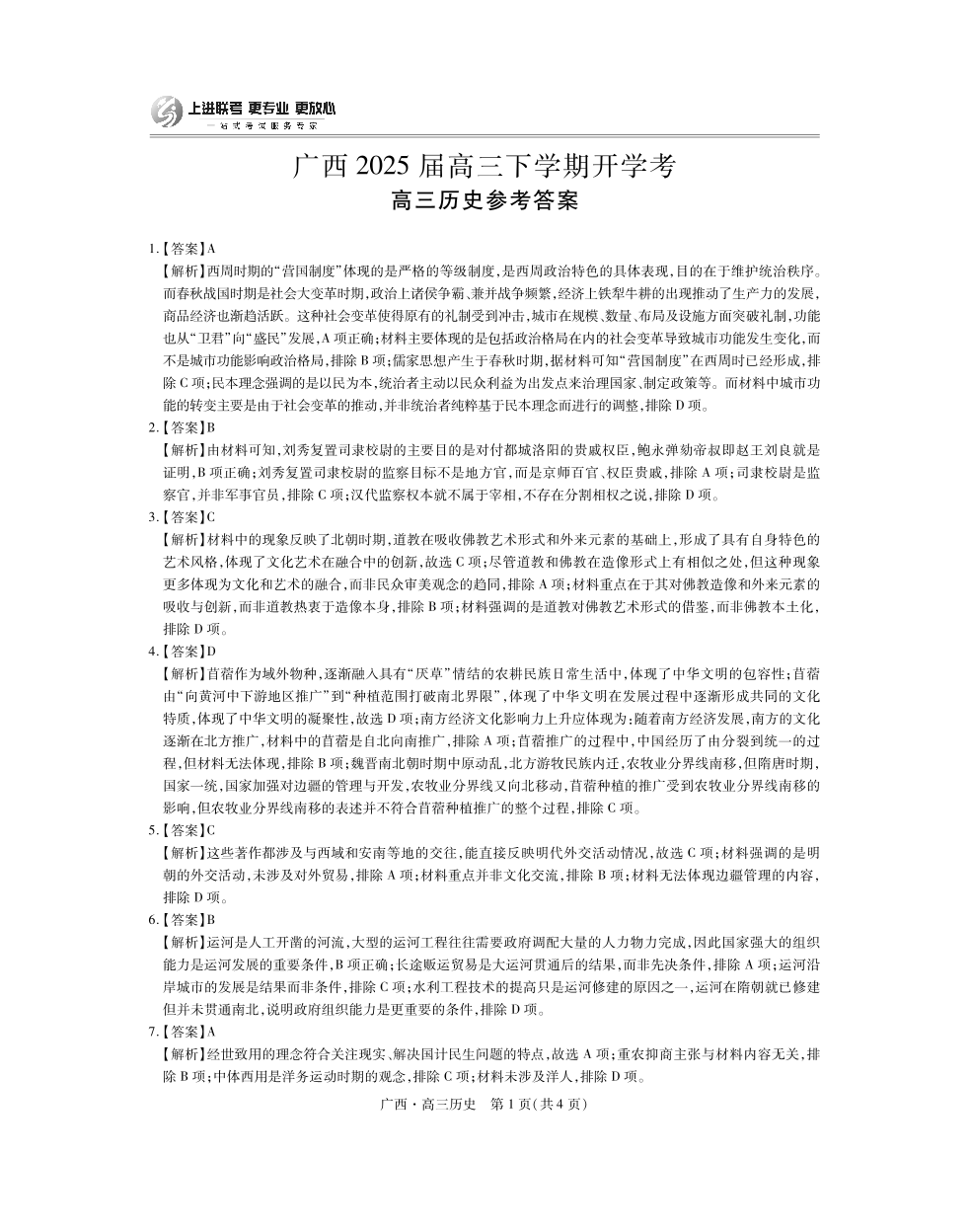 广西省稳派上进联考2024-2025学年下学期2月高三开学考试历史答案