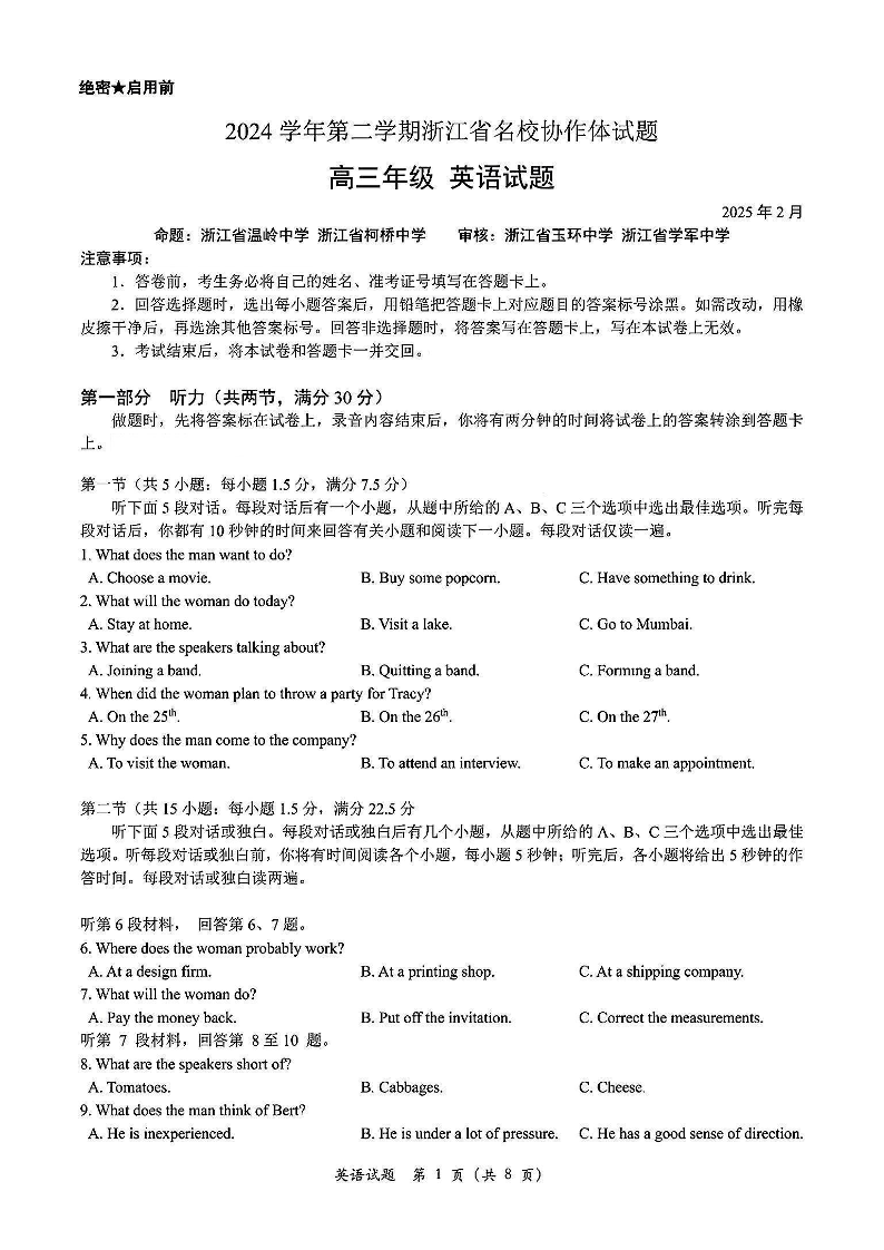 浙江省G12名校协作体2024-2025学年下学期2月高三返校联考英语