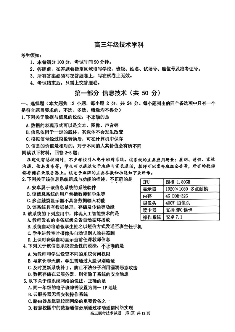 浙江省G12名校协作体2024-2025学年下学期2月高三返校联考技术