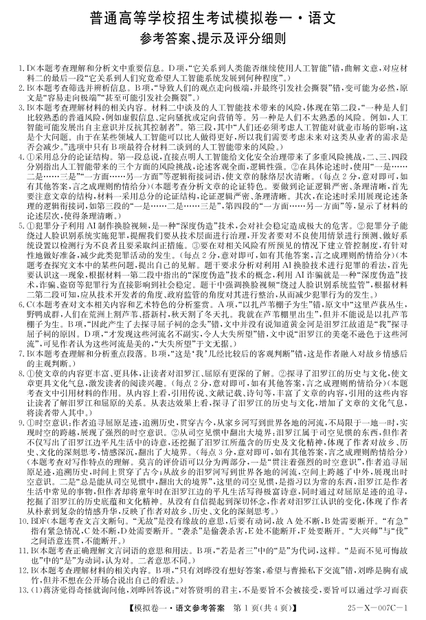 河南省新高中创新联盟2024-2025学年下学期高三模拟卷一语文答案