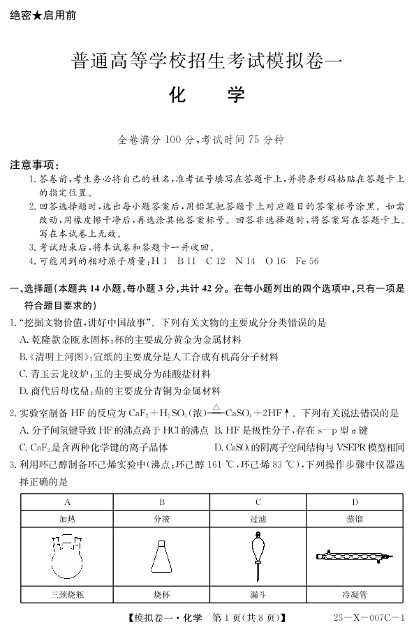 河南省新高中创新联盟2024-2025学年下学期高三模拟卷一化学