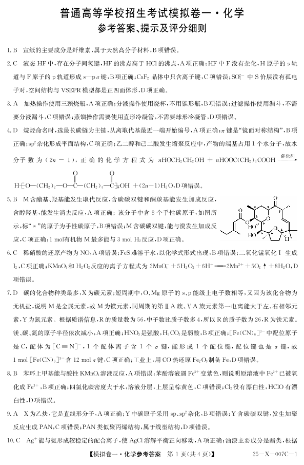 河南省新高中创新联盟2024-2025学年下学期高三模拟卷一化学答案