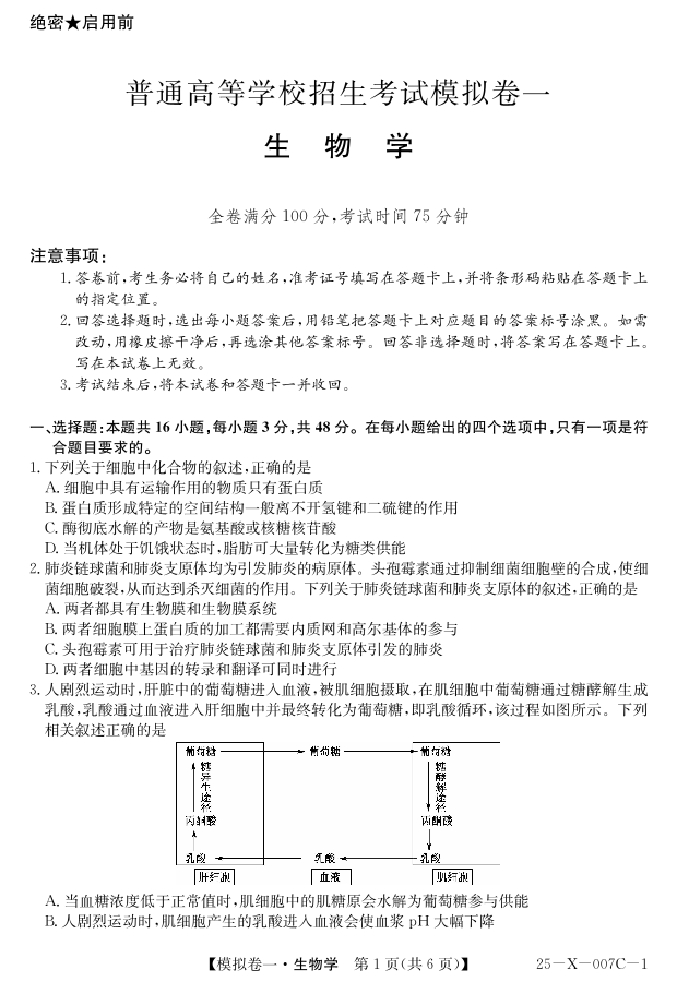 河南省新高中创新联盟2024-2025学年下学期高三模拟卷一生物