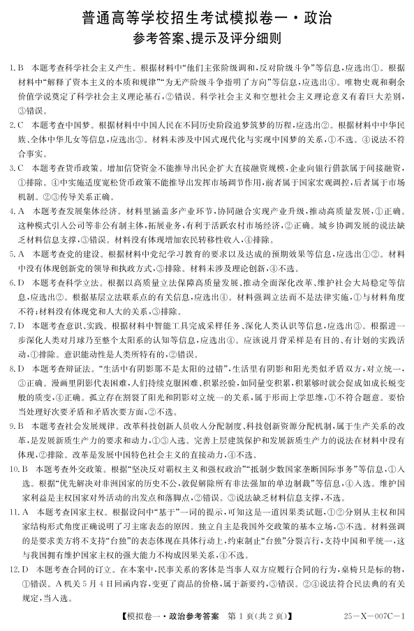 河南省新高中创新联盟2024-2025学年下学期高三模拟卷一政治答案