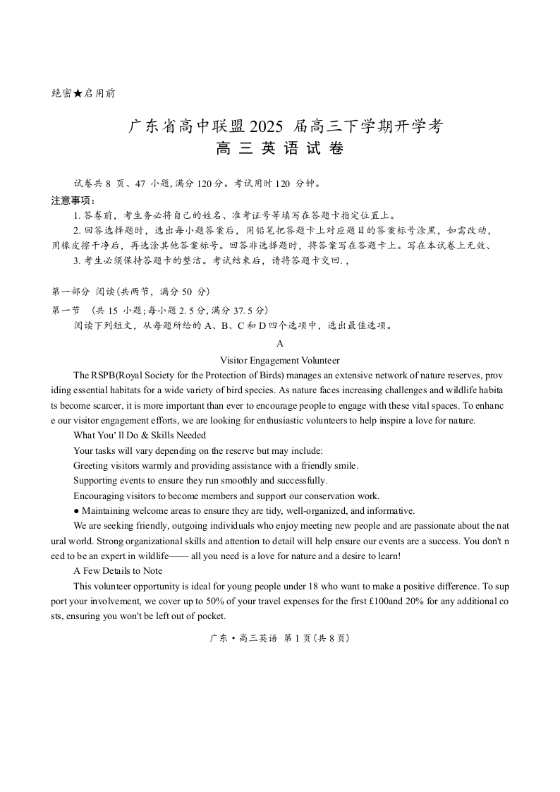 广东省领航高中联盟2024-2025学年下学期2月高三开学考英语+答案