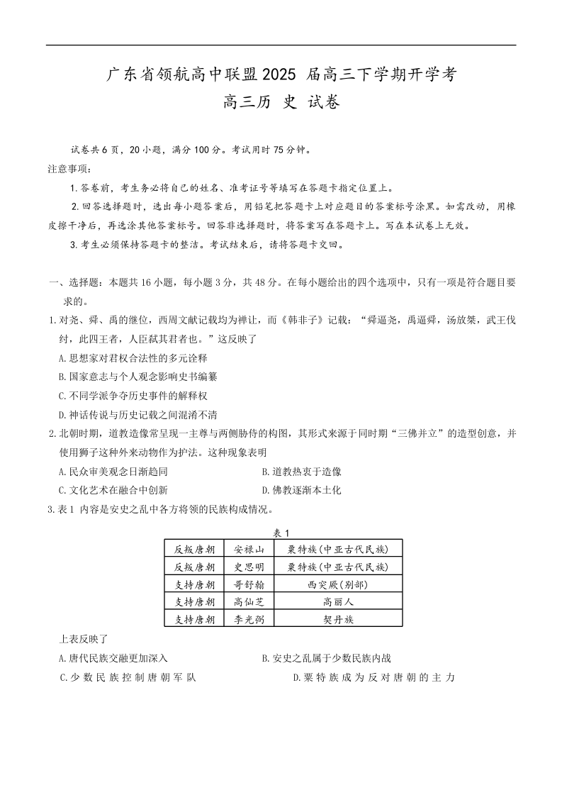 广东省领航高中联盟2024-2025学年下学期2月高三开学考历史