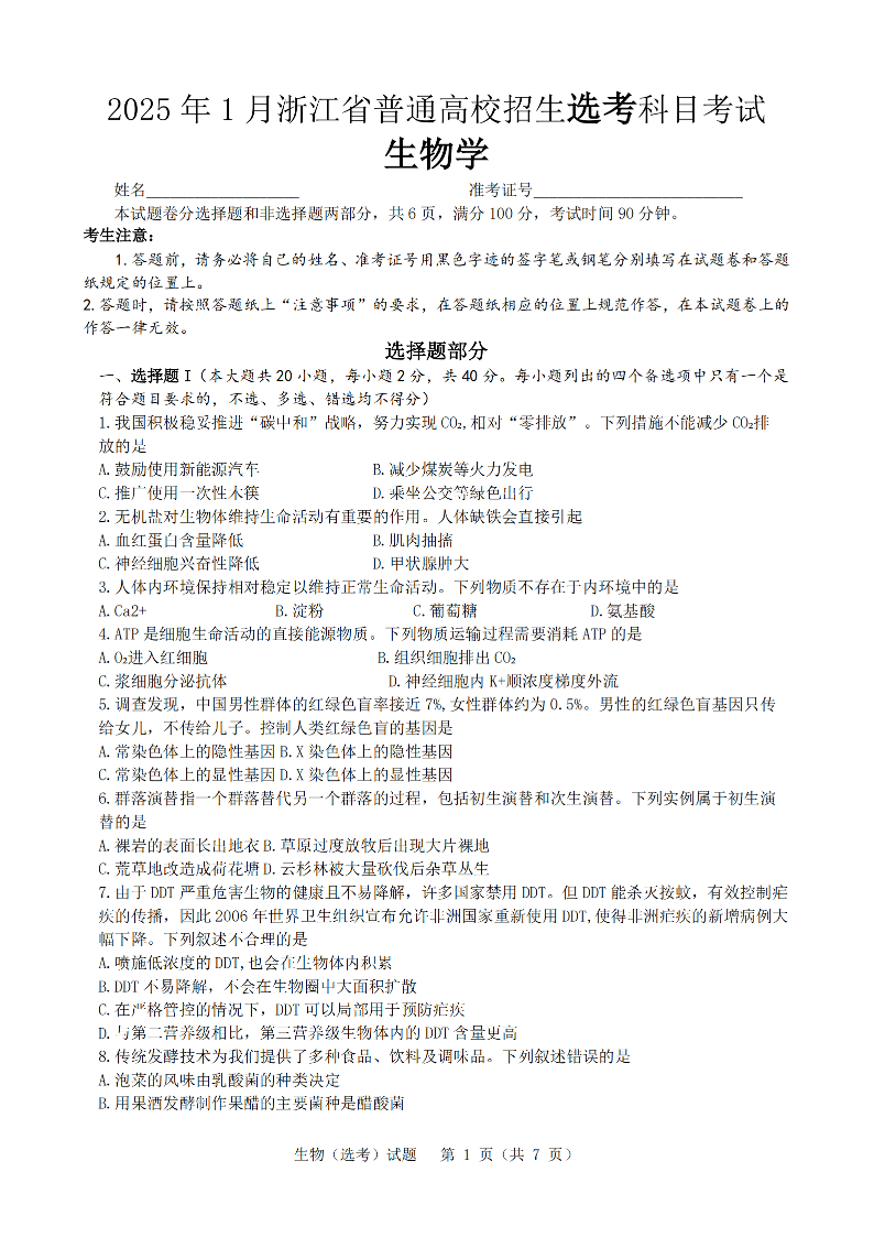 2025年1月浙江省普通高等学校招生选考科目考试生物+答案