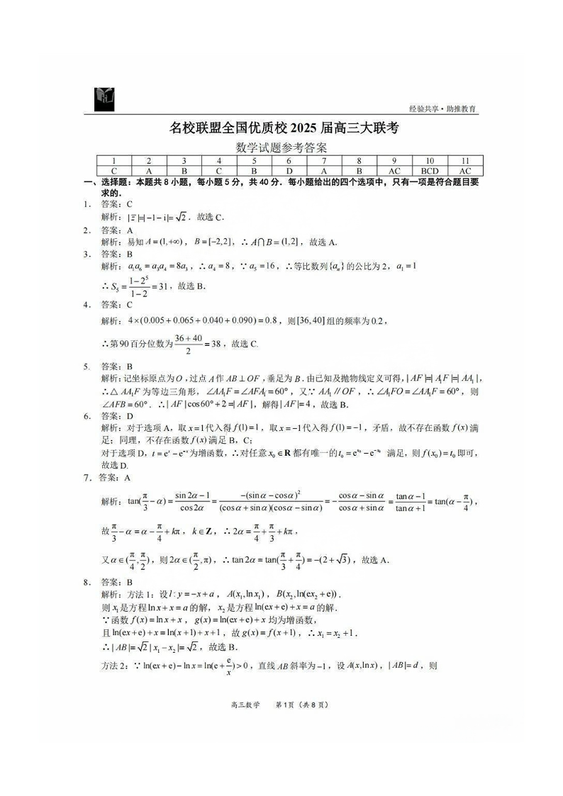福建省名校联盟优质校2024-2025学年下学期2月高三联考数学答案