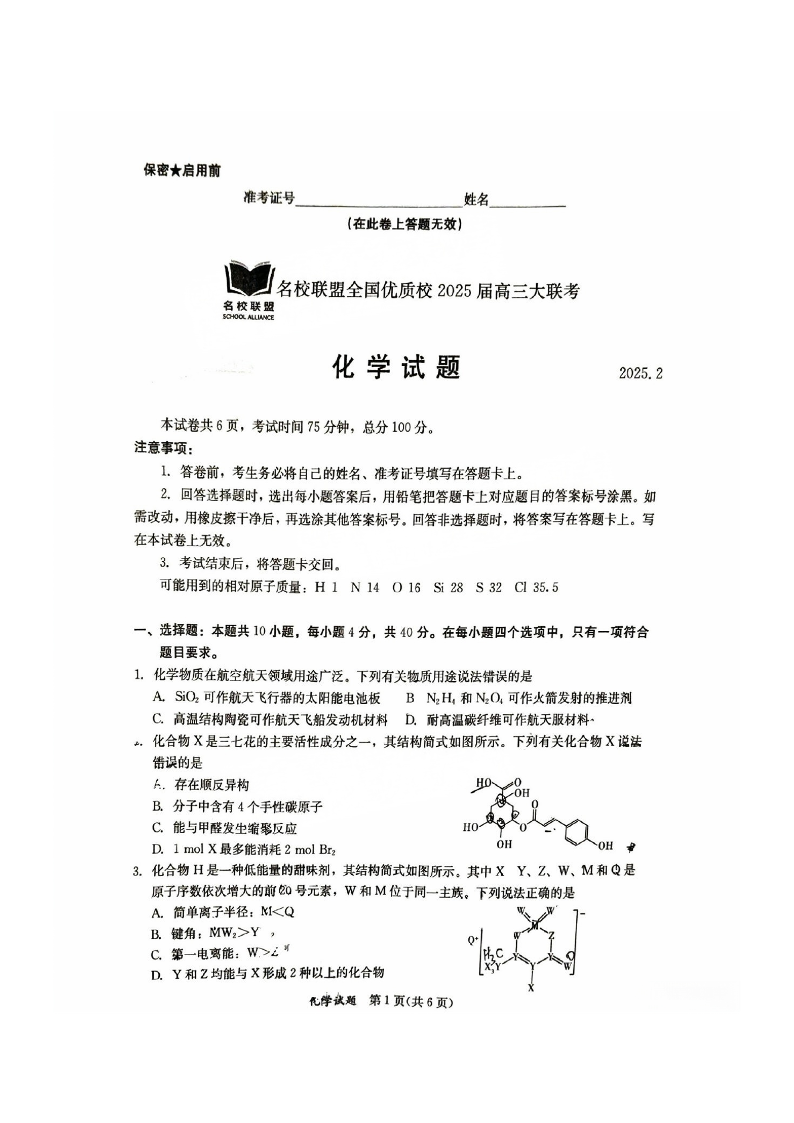 福建省名校联盟优质校2024-2025学年下学期2月高三联考化学
